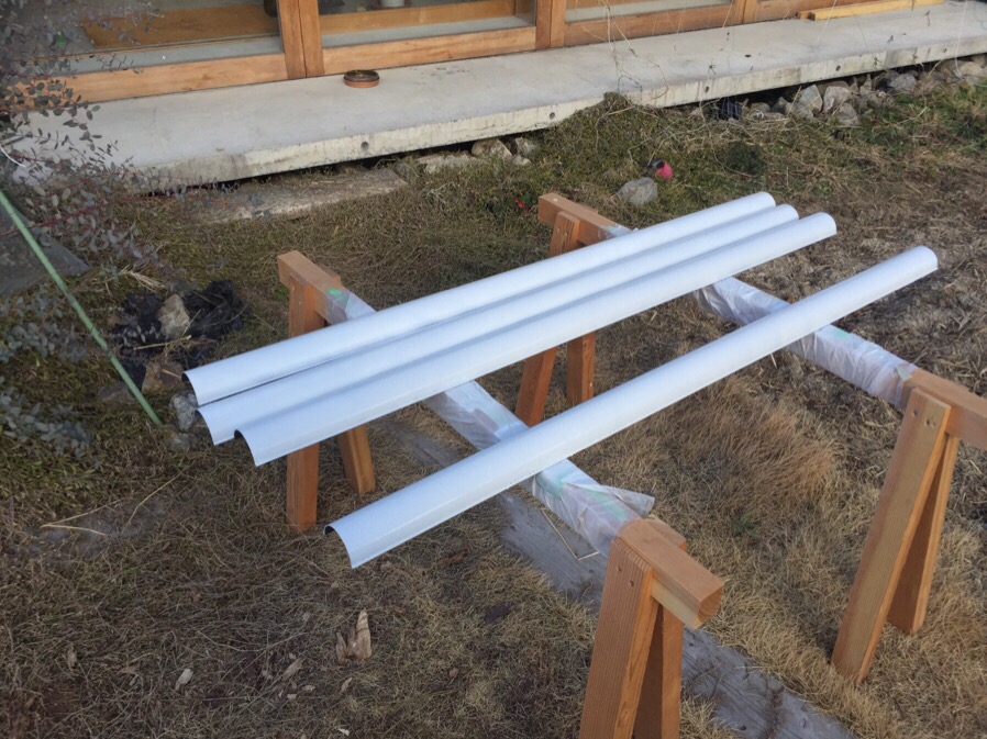 アトリエの屋根には雨樋がありません。 それにはいろいろな事情や 理由があったからなのですが、 それはまた追々お話するとして、 この度訳あって雨樋を設置することにしました。 現場で余ってしまった茶色の塩ビ雨樋があったので 庭で白に塗りかえました。 次は設置の準備に取り掛かります。