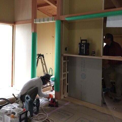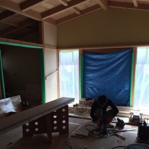 岐阜本巣 「上保の平屋」 キッチン前面のカウンターが現場に届きました。 材質はナラの無垢板です。 大工のiさんが加工の真っ最中でした。 造作工事完了まであと少し! [caption id="" align="alignnone" width="300"]