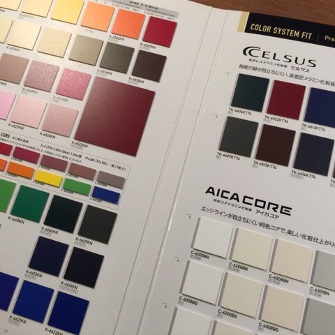 岐阜本巣 「上保の平屋」 ちょっと早い気もしますが、 仕上げ材料の色などを検討しつつあります。 今度クライアントご夫婦にお見せするのは、 メラミン化粧板の見本帳。 洗面器を置くカウンターに使います。 トイレや洗面などの水周りのカウンターに使う 材料はムク板や人工大理石、ステンレス、タイルなど 様々で、毎回悩みの種となっています。 上保の平屋では掃除やメンテナンスの……