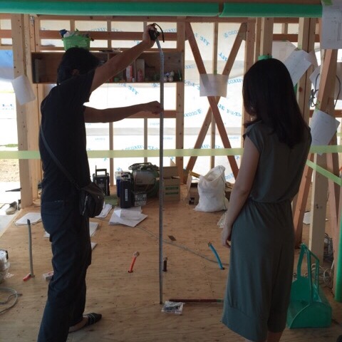 岐阜本巣 「上保の平屋」 今日は現場でお施主さまと打ち合わせ。 進捗状況をご説明しました。 現場はそろそろ造作工事の細かい所を 決めていく段階です。 キッチンカウンターや、洗面カウンターは 造作工事で造るので、 奥様と現場で高さの検討をしました。 設計段階ではなかなか実感としては 解りづらいことも、現場で決めるとしっくりきます。 洗面カウンターを40㎜上げて決定となりました。 ……
