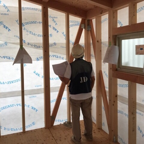 岐阜本巣 「上保の平屋」 筋交いや構造用合板の施工が完了したので、 今日は瑕疵担保責任保険の検査の立ち会い。 検査機関のJIOさんが現場にやってきました。 構造用金物の施工状況や釘のピッチなど 細かく確認をして、「適合」と判定されました。 これで軸組は完成です。[caption width="300" align="alignnone"]