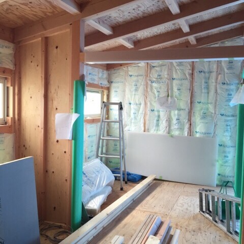 岐阜本巣 「上保の平屋」 筋交いなどの取り付けが終わり、 外周りは透湿防水シートで覆われました。 ここで、断熱材の充填が始まりました。 特別なご要望がないかぎり、 吸音特性のあるグラスウールを一般的な方法で 施工してもらっています。 [caption id="" align="alignnone" width="300"]