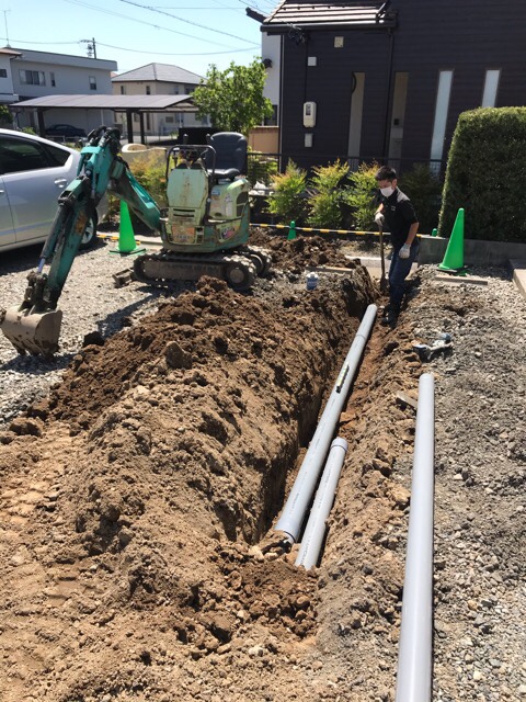 岐阜 茜部大野の家 先行の配管工事です。 上棟では床組が先になるので、 それよりも前に配管工事を行います。 床下に隠れてしまいますが、 住宅にとって給排水は大切な機能ですから、 確実な施工が求められます。
