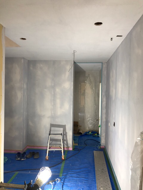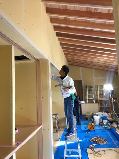 漆喰塗りの下地づくりが始まりました。 現場はたくさんの職人さんで賑やかです。 石膏ボードに漆喰を塗ると、 少なからず割れが発生してしまいます。 少しでも割れにくいように、 下地づくりを作ってもらっています。